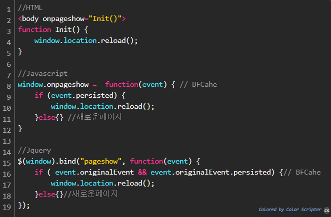 이를 해결하기 위한 방법으로 페이지가 로드될때마다 무조건 발생하는 onpageshow 이벤트를 사용합니다.