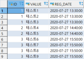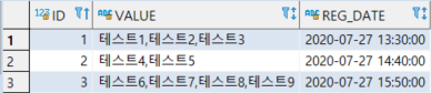 SELECT 1 AS ID, '테스트1,테스트2,테스트3' AS VALUE, '2020-07-27 13:30:00' AS REG_DATE FROM DUAL